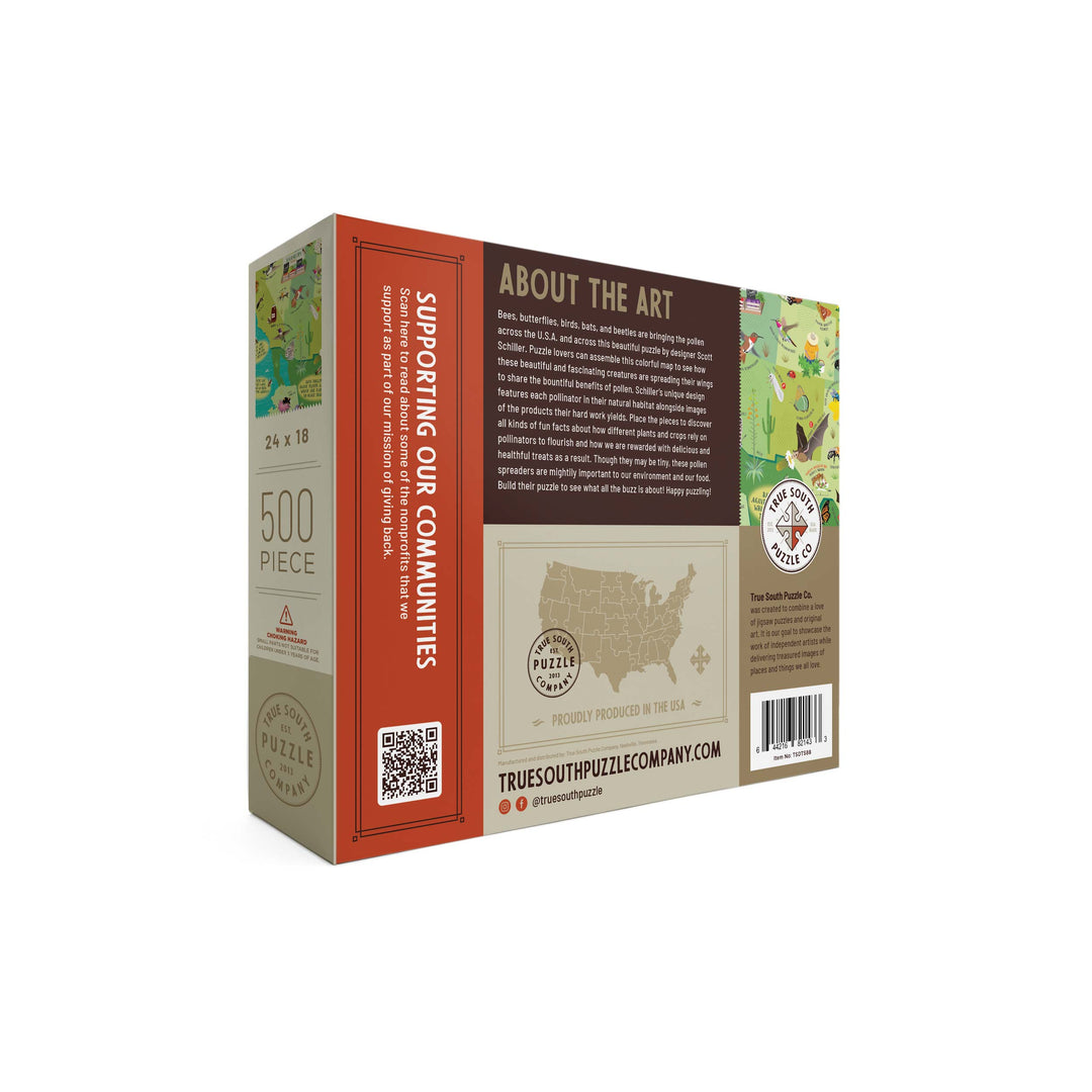 Scott Schiller's design features pollinators in their habitats alongside the fruits of their work. Made with sturdy 80-point blue board and filled with fun facts, this puzzle blends art and nature beautifully.